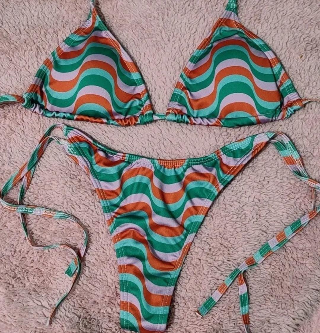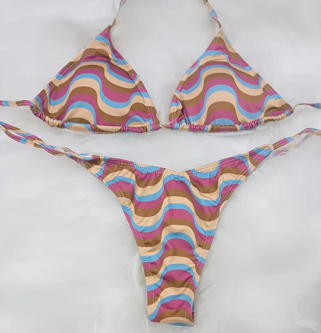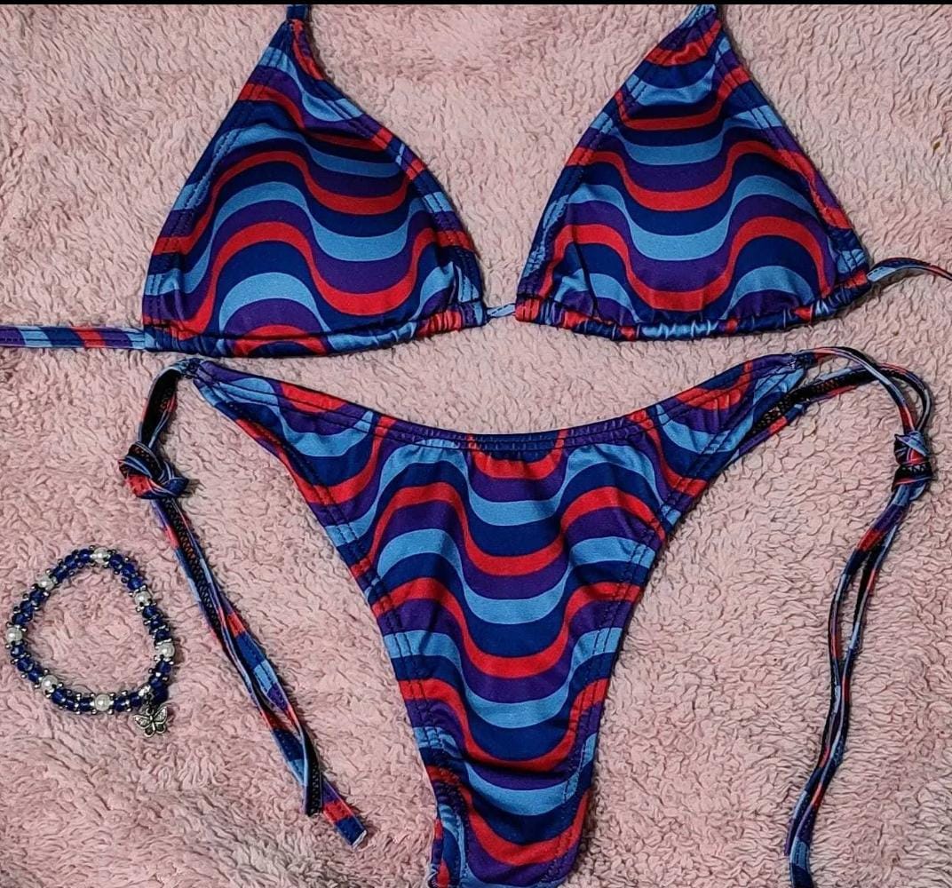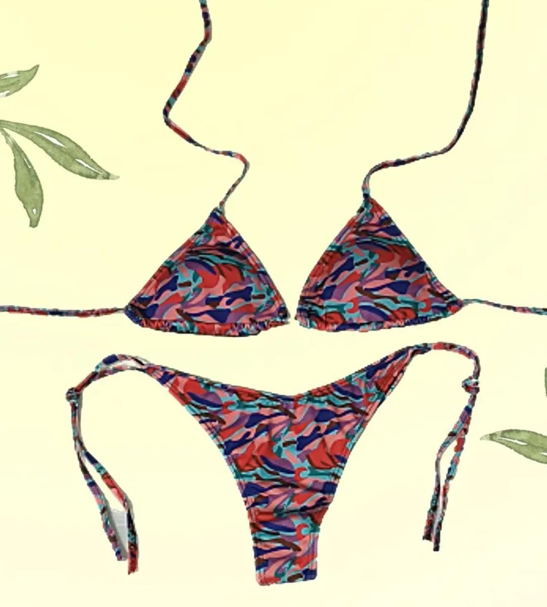 Conjunto con taza desmontable que realza y da soporte, y bombacha colaless en V con tiras para atar, súper adaptable al cuerpo.