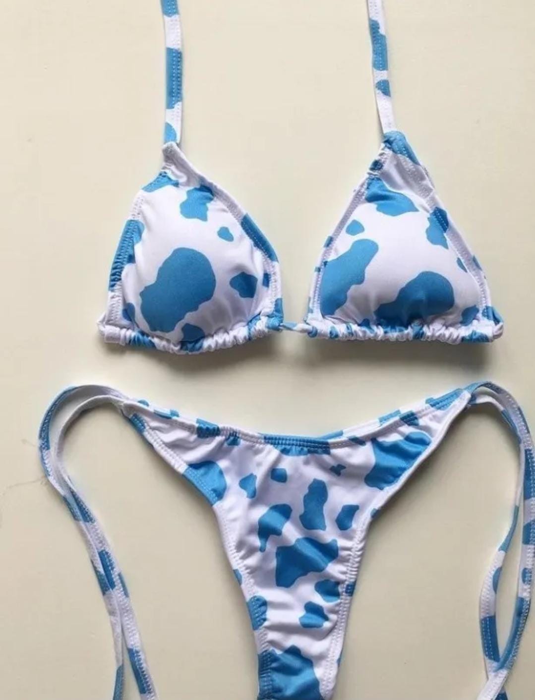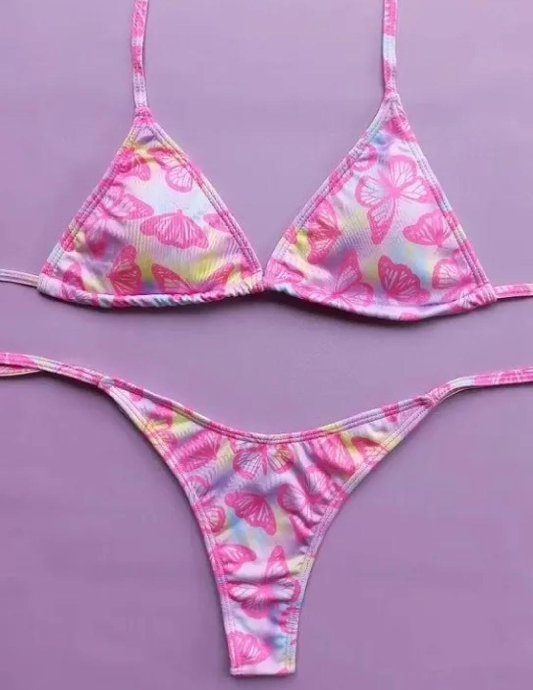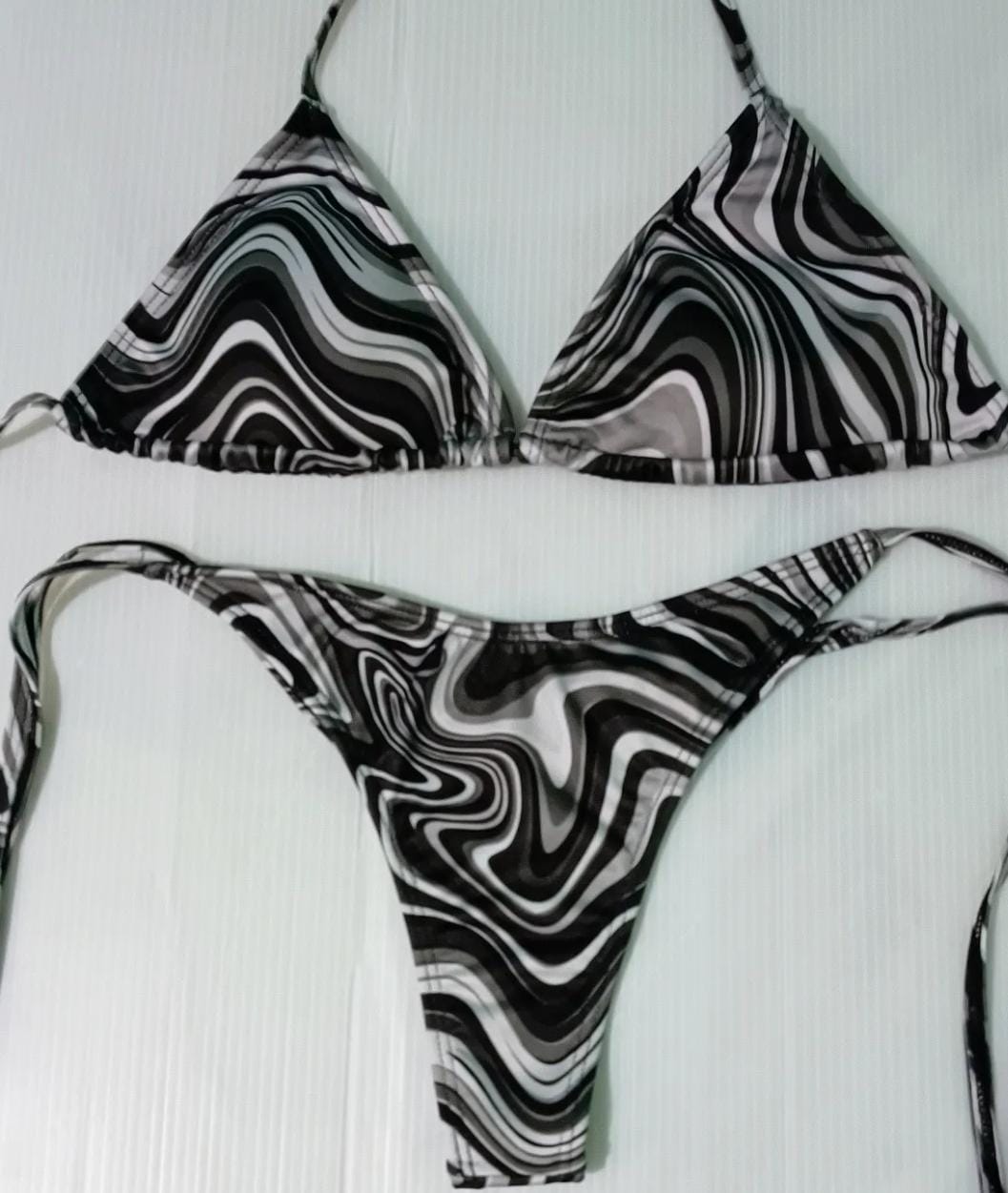 Conjunto con taza desmontable que realza y da soporte, y bombacha colaless en V con tiras para atar, súper adaptable al cuerpo.